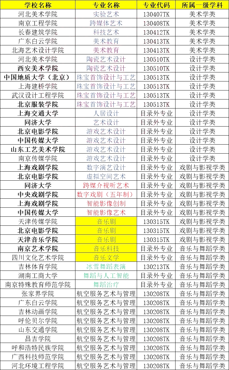 在下表中,美术设计类专业以蓝色标注,音乐类专业用黄色标识,舞蹈类专业则标记为绿色,而航空服务艺术与管理专业被分类为表演类。